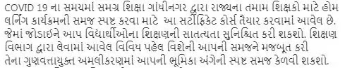 This Certificate Course has been prepared by the entire Shiksha Gandhinagar in the time of COVID 19 to clarify the understanding of Home Learning Program for all the teachers of the State. By joining, you will be able to ensure the continuity of students’ education. Strengthen your understanding of the various initiatives taken by the Department of Education and have a clear understanding of your role in its quality implementation.